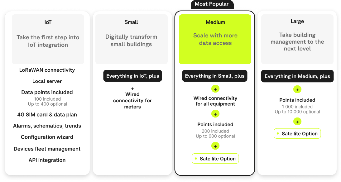 At the core of this update is the introduction of the Bridge IoT+ licence, making LoRaWAN more accessible for smaller buildings. With IoT+, you get 250 connected In points (that's 150 more points than our standard IoT licence). The Medium licence also gets an upgrade with a max of 500 connected In points.
