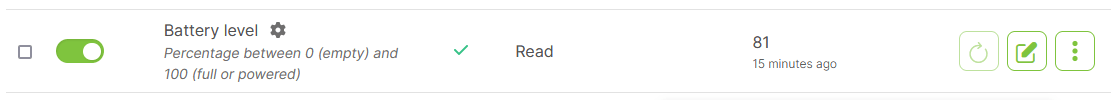 If your equipment complies with the LoRaWAN standard specification on battery levels (see section 5.5 of specification 1.0.3), you have a new system property that gives you access to the battery level of your equipment. The value of this level is a percentage between 0%, empty battery, and 100%, full battery.