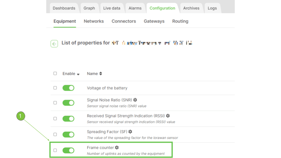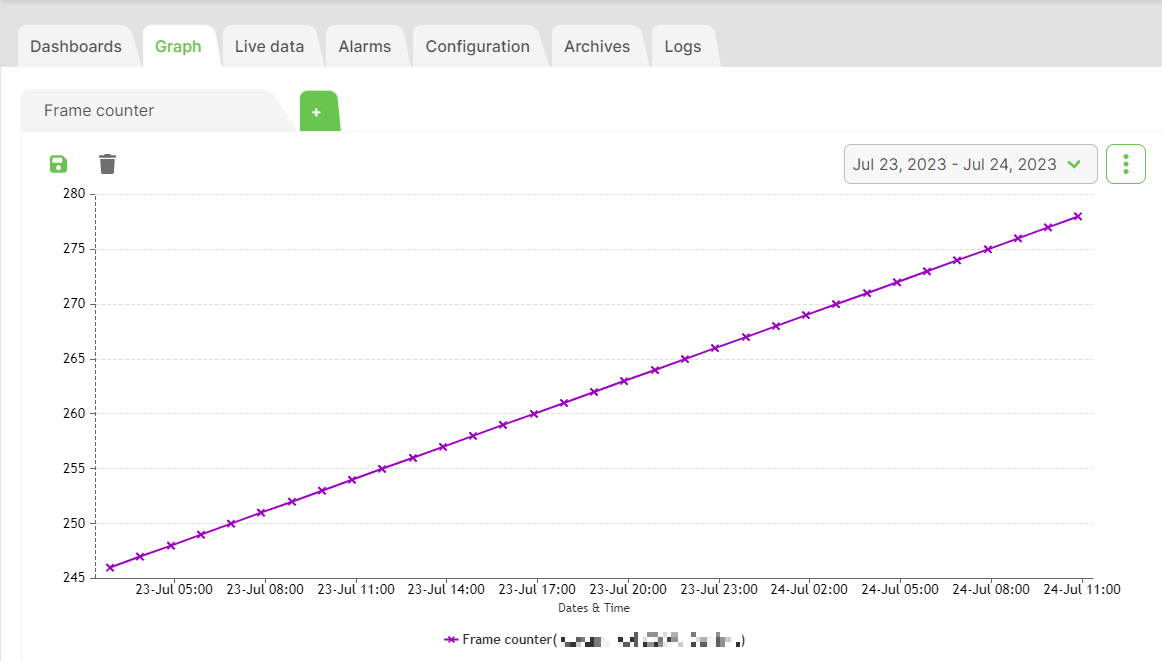 - In class C (powered sensors), there is a first-in-first-out queue per device. Downlinks are transmitted to the equipment as they are received, with a 13-second delay. - Finally, the frame counter is a new feature available free of charge for all your LoRaWAN equipment. Thanks to it, you can ensure the Wattsense box receives the frames correctly. Remember to add the new property to your configurations.