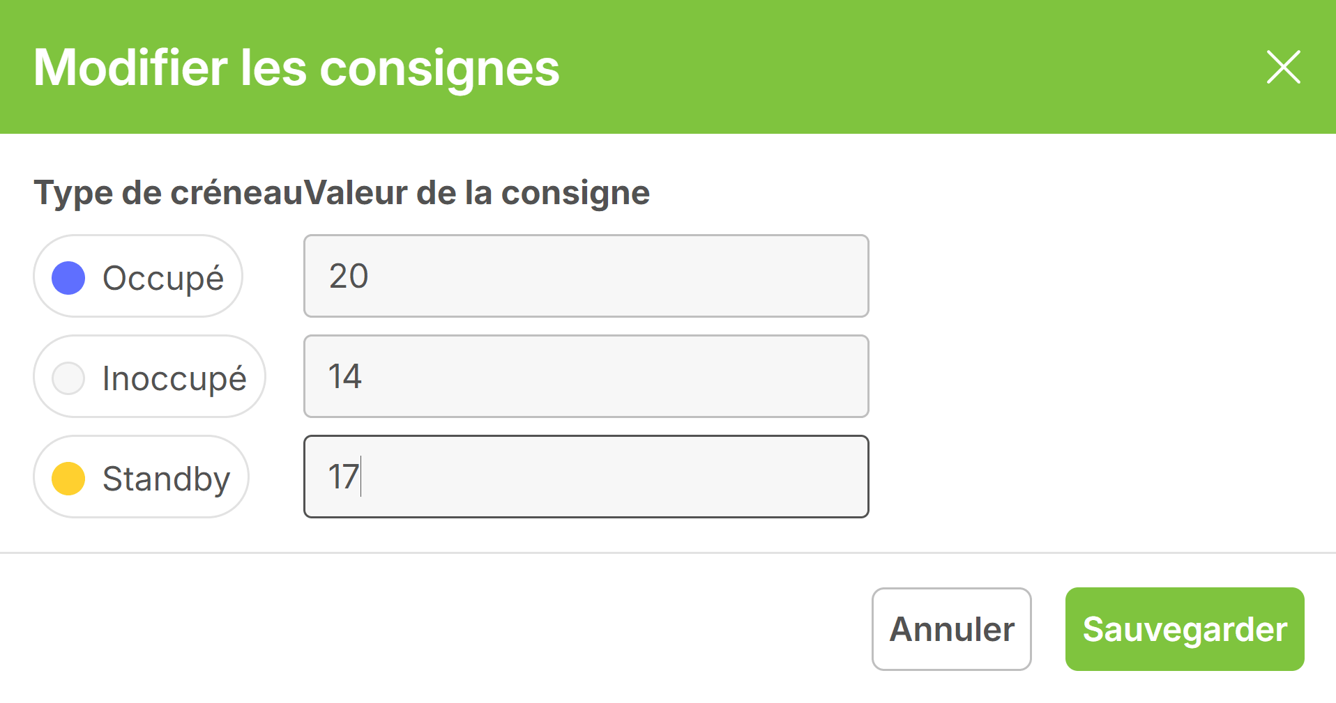 - Définissez la température de consigne à appliquer à chaque planning selon sa période d’occupation