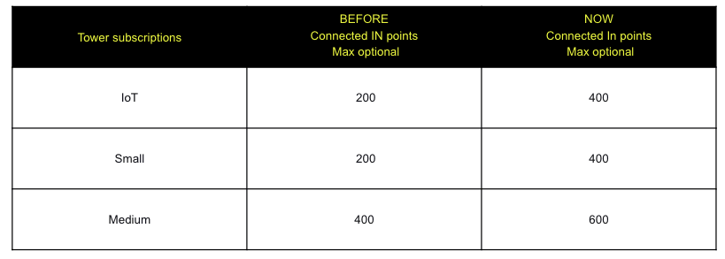 We're introducing a higher maximum of connected In points for your preferred Tower Subscriptions: IoT, Small and Medium. Our extra connected In points allow you to tailor your subscription to align with specific project requirements.